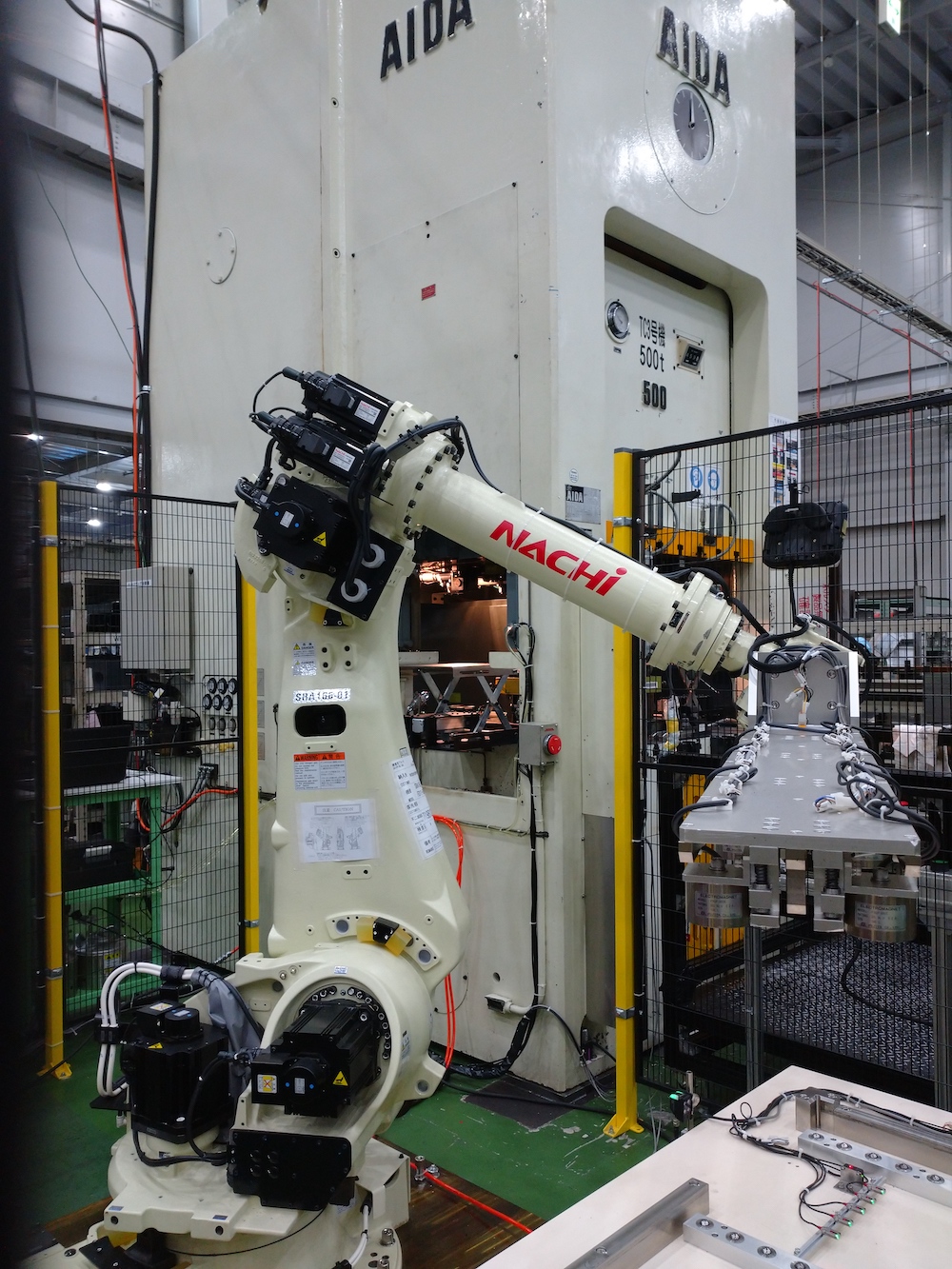 500tプレスに連動させております。今まで作業者が材料を手で持って行っており、負荷が非常に高い作業でしたが、ロボットにやってもらうことになりました。